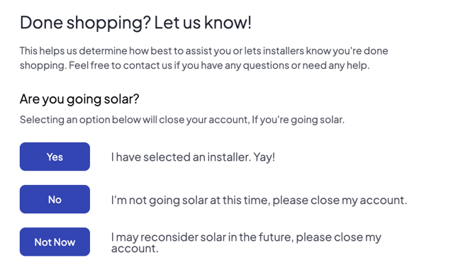 💡Tip: Once your account is closed, you’ll no longer receive installer messages, quote updates, or notifications from EnergySage.
