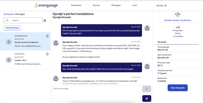 💡Tip: You can request updates from multiple installers to compare different equipment or financing options side by side.