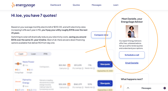 Our Energy Advisors are here to help with any questions you might have about your quotes, installer options, solar equipment, financing, incentives, or just the process of going solar in general!
